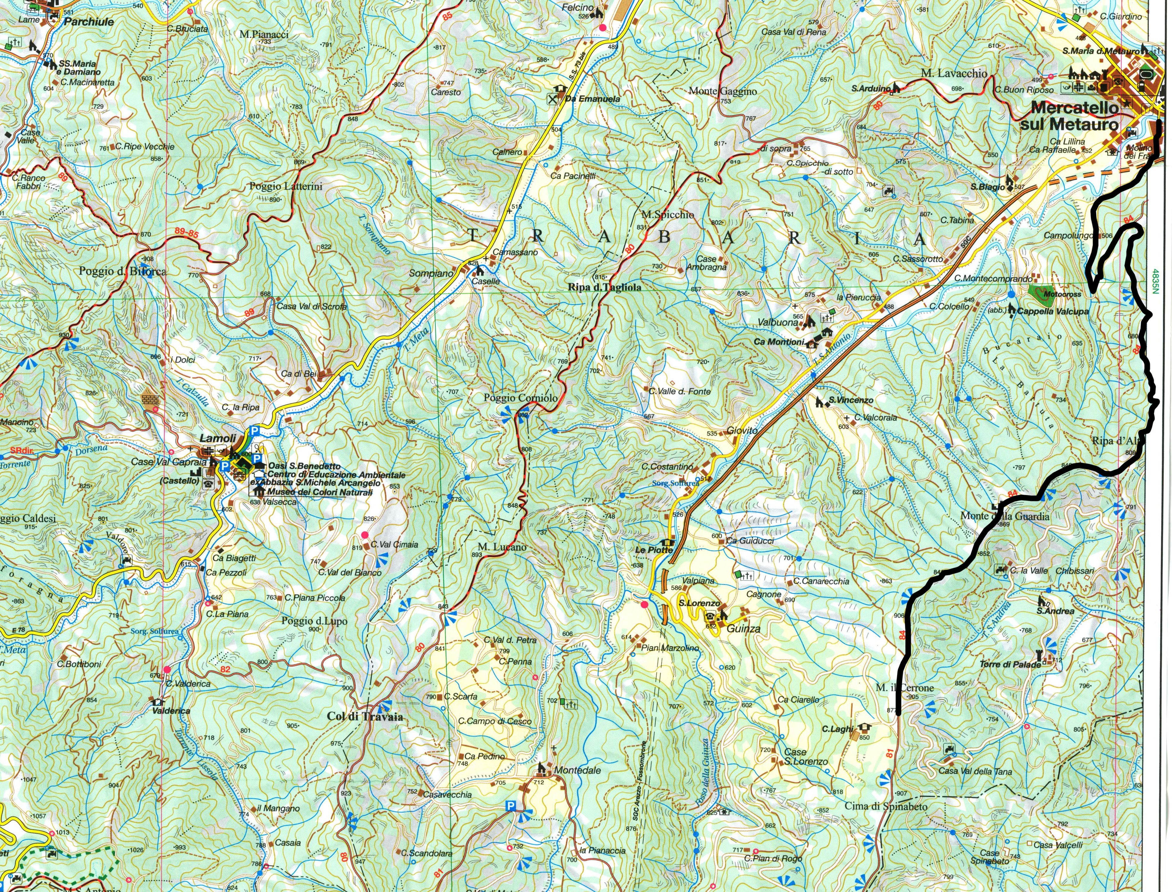 Si parte, come detto, da Mercatello, a pochi metri di distanza dalla strada provinciale, da dove si svolta a sinistra nei pressi dell’unico semaforo che si incontra all’interno del paese, si scende leggermente oltrepassando il ponte sul torrente S. Antonio e si raggiunge l’attacco del sentiero, ben segnalato da una tabella indicante i tempi di percorrenza.