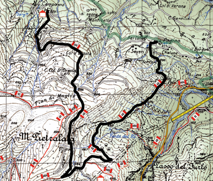 Dopo aver incrociato in un paio di frangenti una delle tante strade sterrate che salgono verso i prati sommitali del Pietralata, il tracciato si inoltra in una stretta valle costeggiando l’impluvio di un piccolo torrente, prima di raggiungere il rifugio di Casa Campolino, nei pressi della quale ha termine.