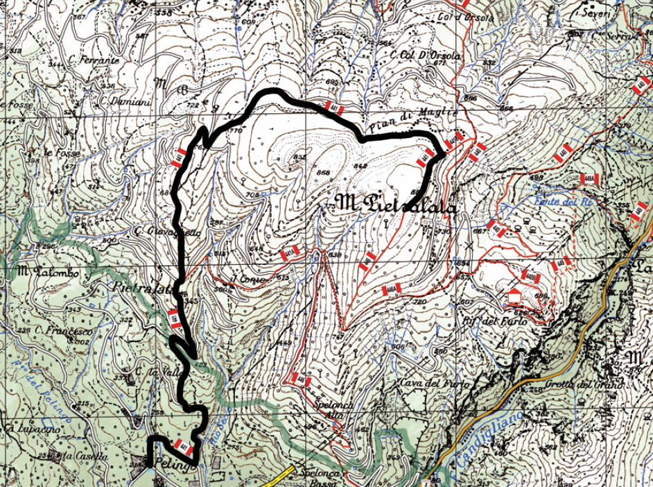Il lungo falsopiano ha termine nel punto in cui si incrocia, da sinistra, il sentiero 441B che funge da raccordo con il sottostante tracciato del sentiero 440. Qui si svolta a destra, ai margini del prato, su una traccia ben segnalata che conduce in poco tempo alla vetta del Pietralata, contrassegnata da una piccola croce e circondata dall’ampio prato che si estende a perdita d’occhio verso ovest. Dalla vetta si può proseguire sul sentiero 446, che scende sull’altro lato diretto al cuore della Gola del Furlo.