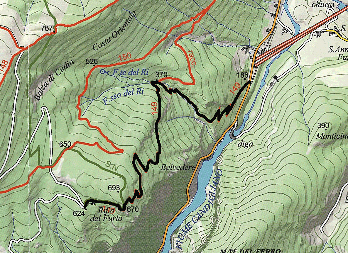 Il tratto tortuoso ha termine dopo alcune centinaia di metri, quando il bosco si dirada permettendo di ammirare per la prima volta lo spettacolo della gola, con le prime viste dall’alto della diga e delle strapiombanti pareti che la circondano. Superato il punto panoramico si risale a fianco del torrente Ri, che il sentiero incrocia due volte mediante semplici guadi (non vi è mai una quantità abbondante di acqua, si tratta di passaggi non impegnativi).