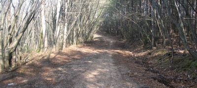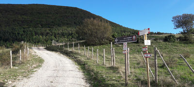 Superato un impluvio ed affrontati circa 150 metri di dislivello si sbuca infine sulla strada sbrecciata, che si segue in salita per breve tempo prima di svoltare nuovamente su sentiero, verso sinistra, ancora con pendenze notevoli.