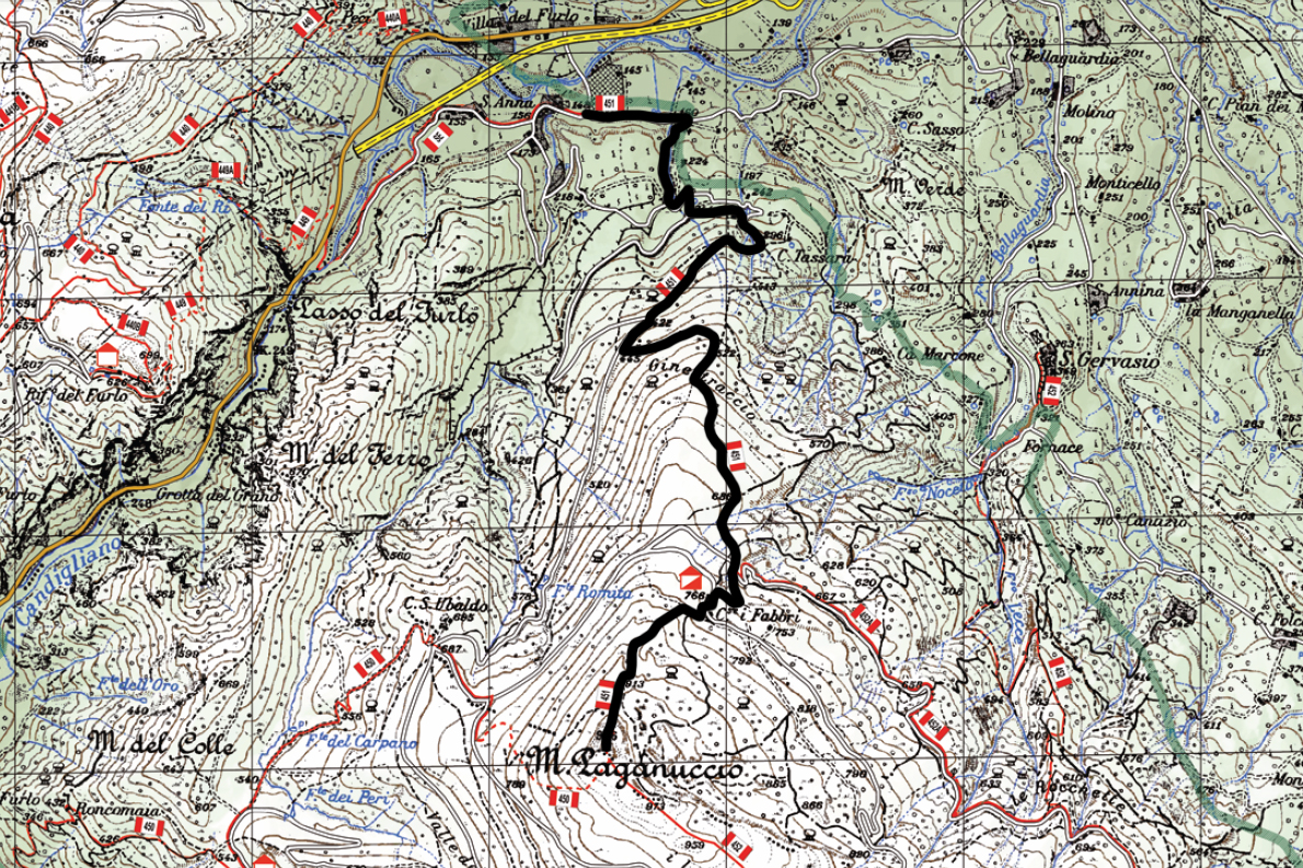 Superato il rifugio si svolta nuovamente a destra entrando nell’ultimo tratto di bosco, proseguendo in discreta salita accompagnati dalla buona segnatura che garantisce l’orientamento, e raggiungendo infine la vetta del Monte Paganuccio, ben riconoscibile per la presenza di una vistosa antenna, punto in cui converge anche il sentiero 450.
