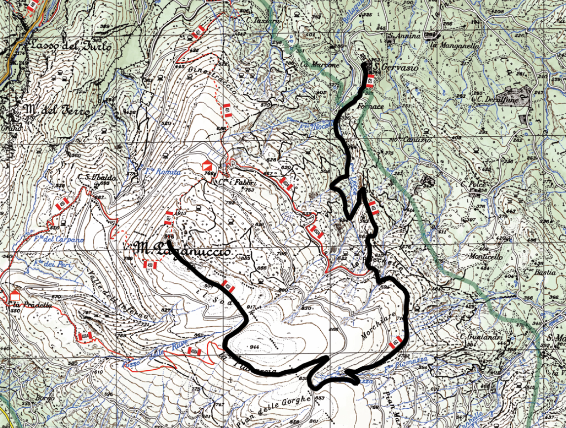 Il sentiero 452 (nuovo percorso, precedentemente con la stessa numerazione vi era un sentiero che partiva da San Gervasio) della Riserva Naturale Statale Gola del Furlo è un lungo itinerario (più di 9km) che collega il Rifugio La Pradella con la vetta secondaria denominata "La Pianaccia", tagliando a mezza costa tutto il versante sud della montagna ed attraversando alcuni caratteristici borghi rurali.