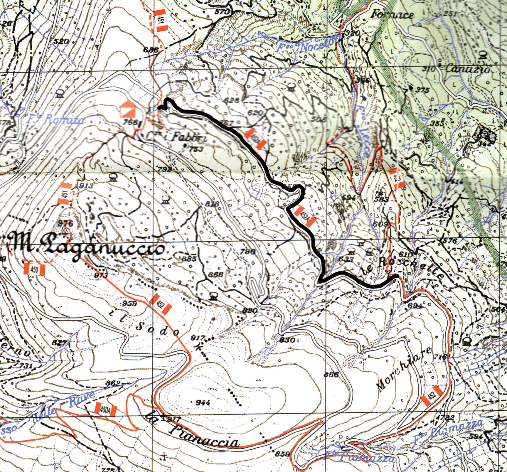 Il percorso termina in prossimità del rifugio Ca' I Fabbri, quando il 452A incrocia il sentiero 451 che scende dalla vetta del Monte Paganuccio, diretto a Sant'Anna.