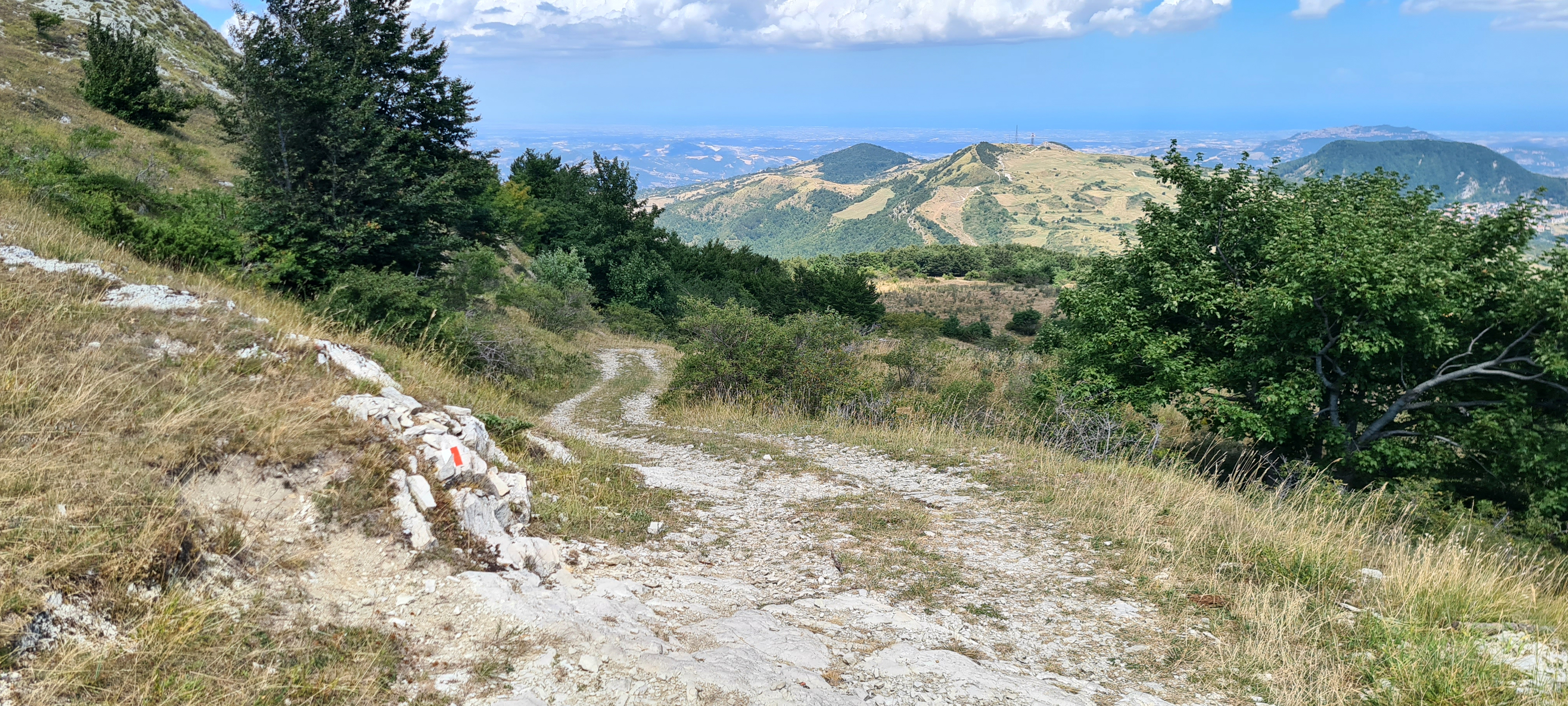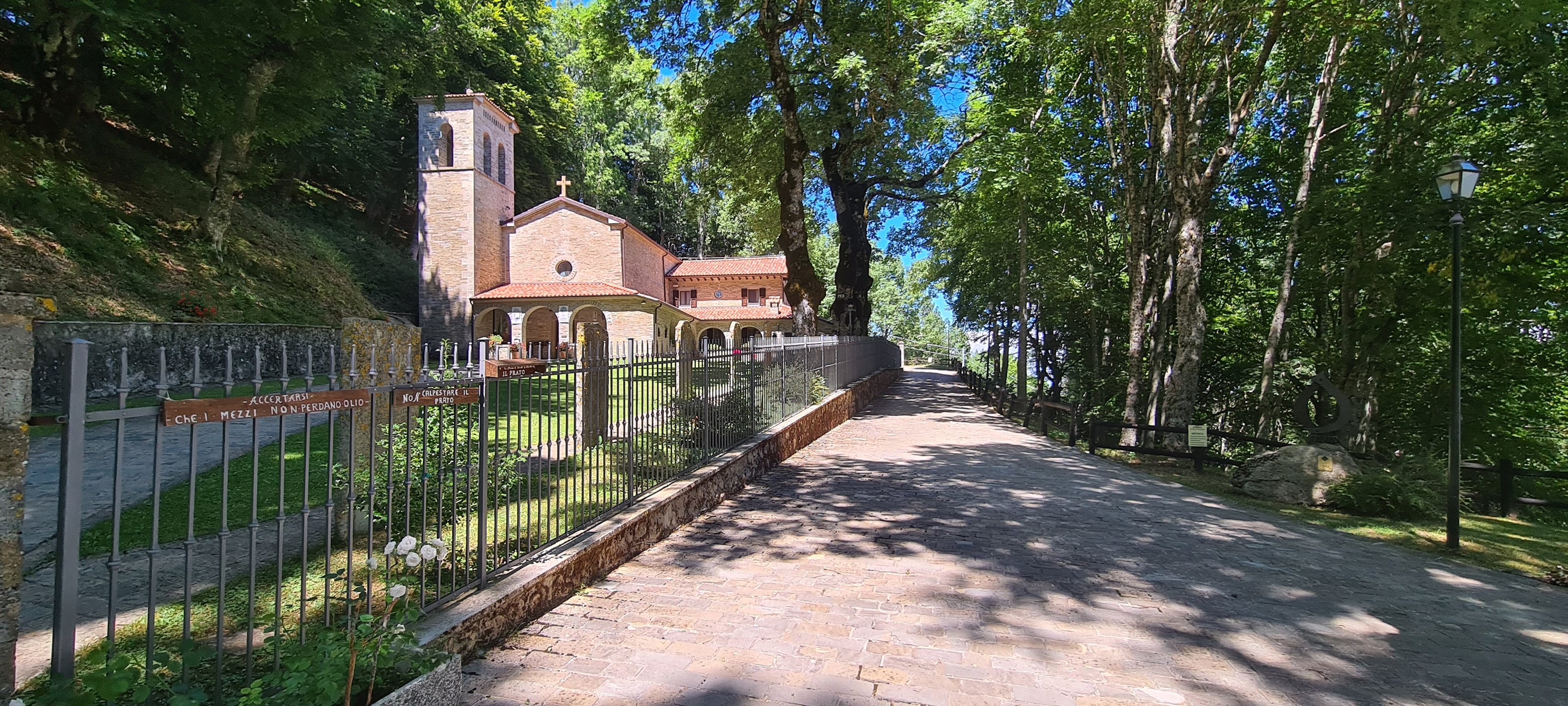 Il punto di partenza è posto proprio di fronte al santuario (dove converge anche il Sentiero 101), la cui recinzione si costeggia lasciandosela alla propria sinistra, mentre si prosegue su una strada lastricata che ben presto diviene sterrata e si inoltra nei prati sommitali.
