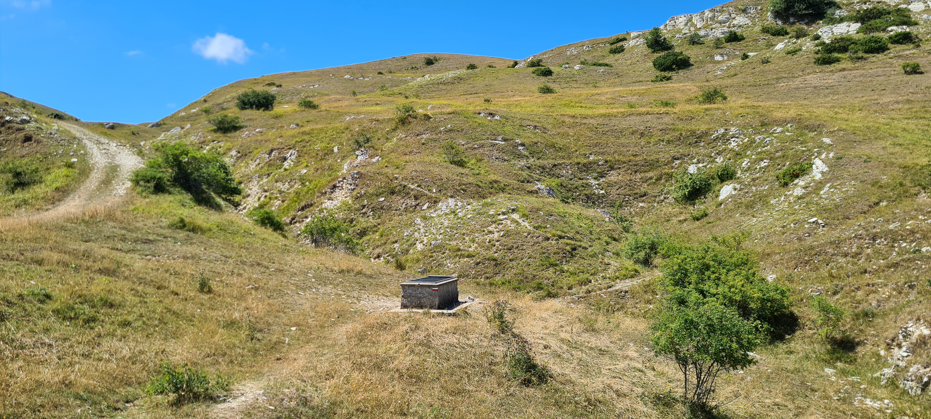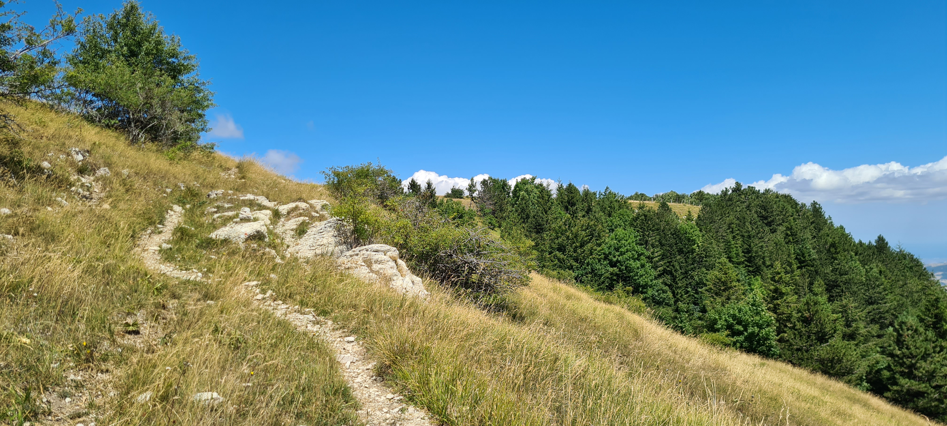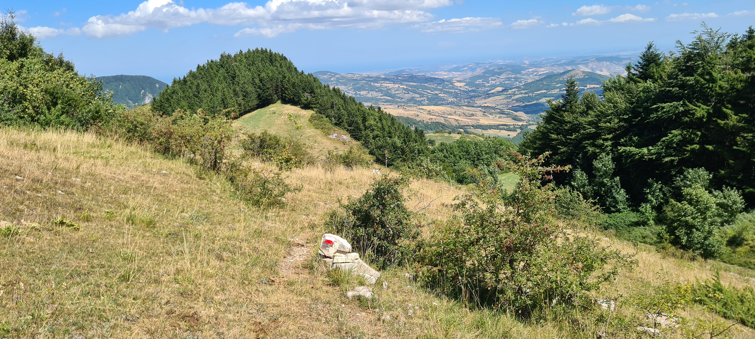 Si giunge ad una edicola del Parco ospitante la cartina del sentiero, posta di fronte ad una croce in legno, superate le quali si prende a salire tra i prati (traccia molto ampia), fino a raggiungere l'area delle Sorgenti del Fiume Conca.