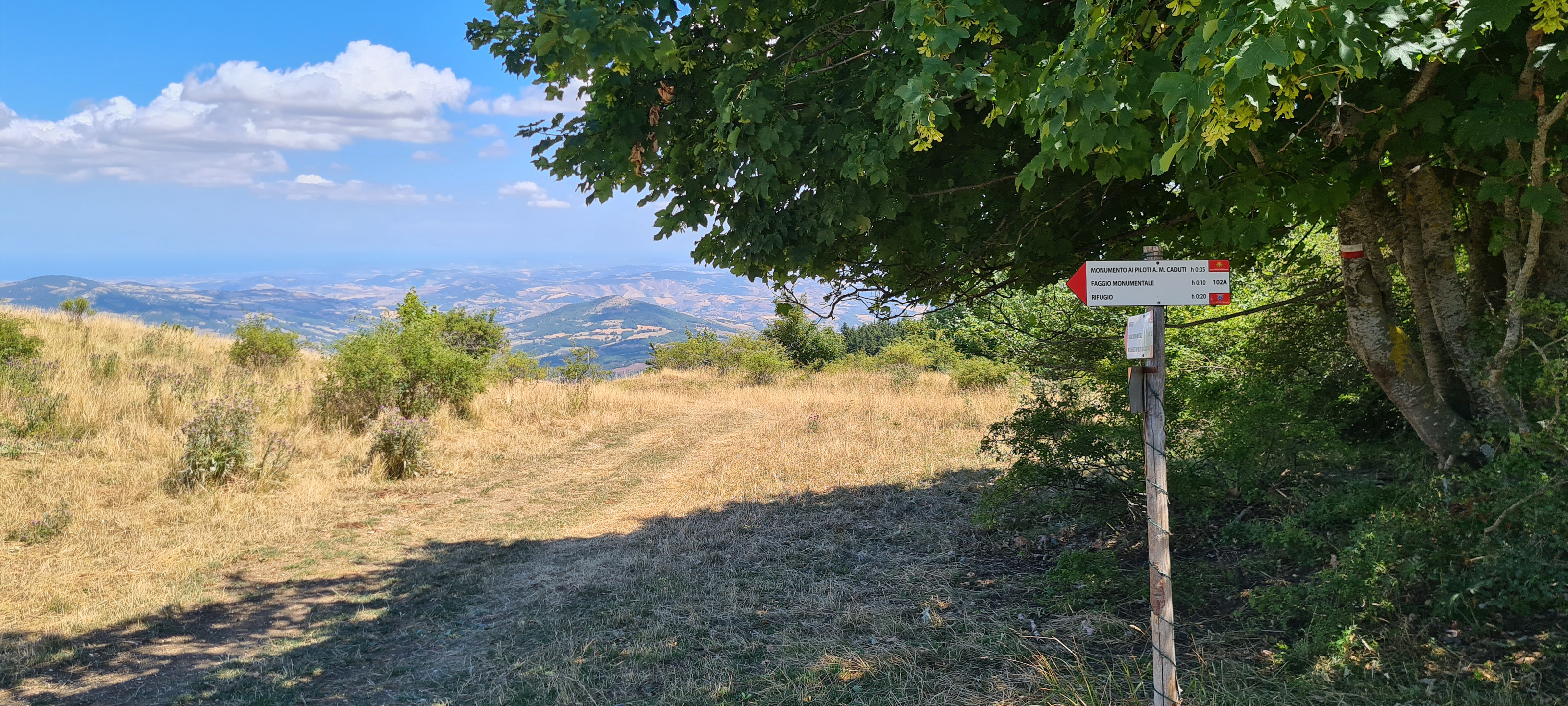 Oltrepassati gli incroci ci si addentra nella faggeta, raggiungendo in circa 5 minuti lo spettacolare Faggio Monumentale, un albero alto ben 28 metri, con una circonferenza di 4,75 metri ed un'età presunta di più di 260 anni. Oltrepassato il faggio il sentiero compie una secca svolta, prosegue in falsopiano ed incrocia nuovamente il 102B, quindi prende a salire decisamente e, mediante alcuni gradini di legno, raggiunge infine il luogo dove è stato posto il Monumento agli Aviatori.