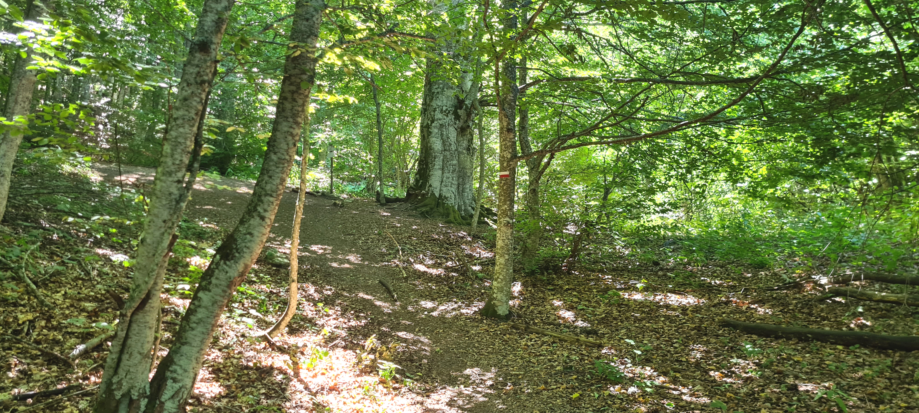 Attraversato quello che a questa quota è solo un piccolo impluvio si continua a guadagnare quota sul versante opposto, prima di raggiungere una caratteristica abetaia, che viene prima costeggiata e poi parzialmente attraversata dal sentiero. Superato il bosco si inizia a scendere rapidamente, sempre su traccia molto ampia, fino a raggiungere una spianata in cui il sentiero si biforca. Da questo punto il percorso è ad anello, è preferibile affrontarlo procedendo diritti sempre in discesa, incontrando dapprima il piccolo Rifugio del Lago di Monte Pietracandella, quindi scendendo ancora di quota fino all'area di sosta posta ai margini della Faggeta di Pianacquadio.