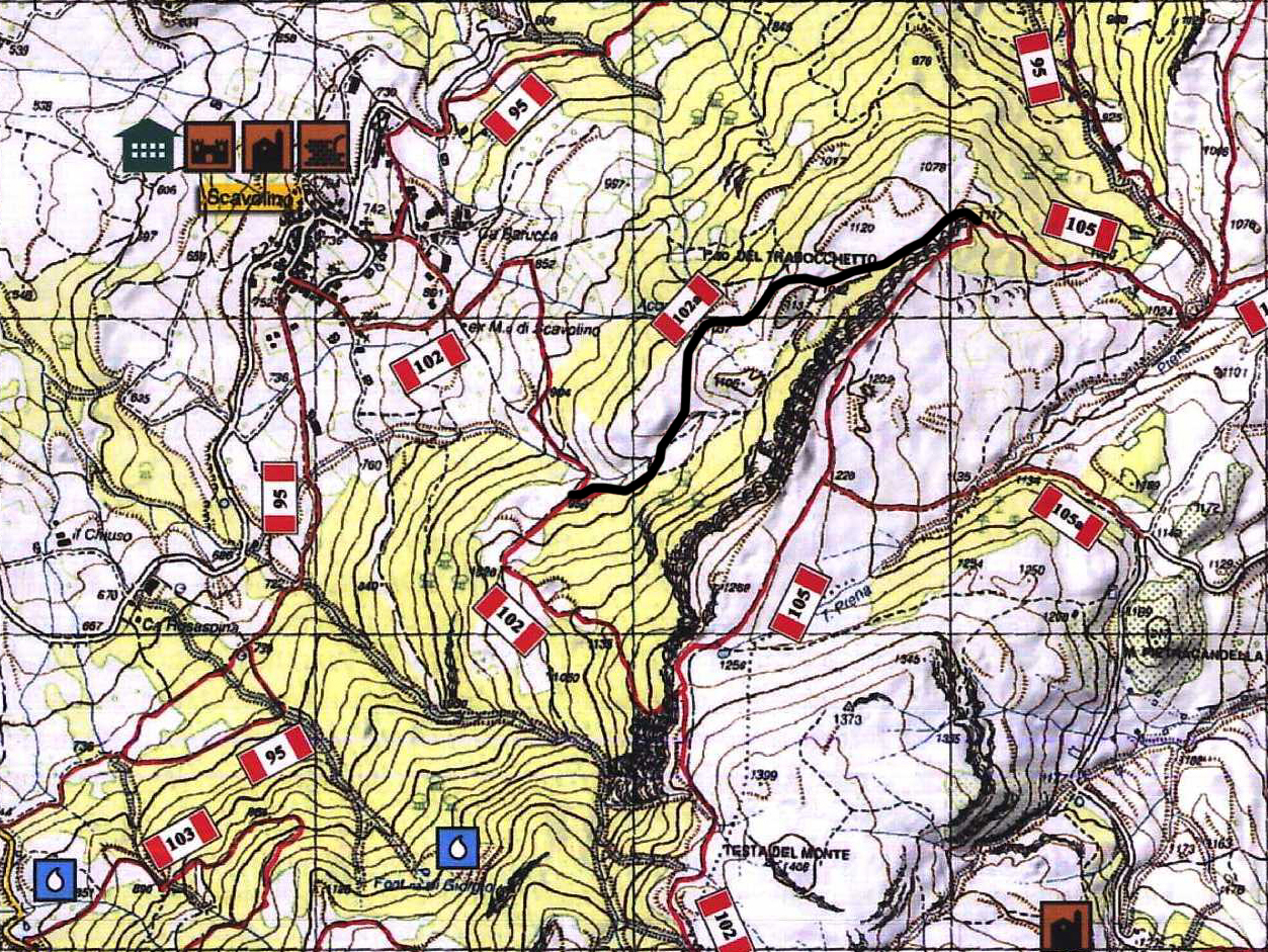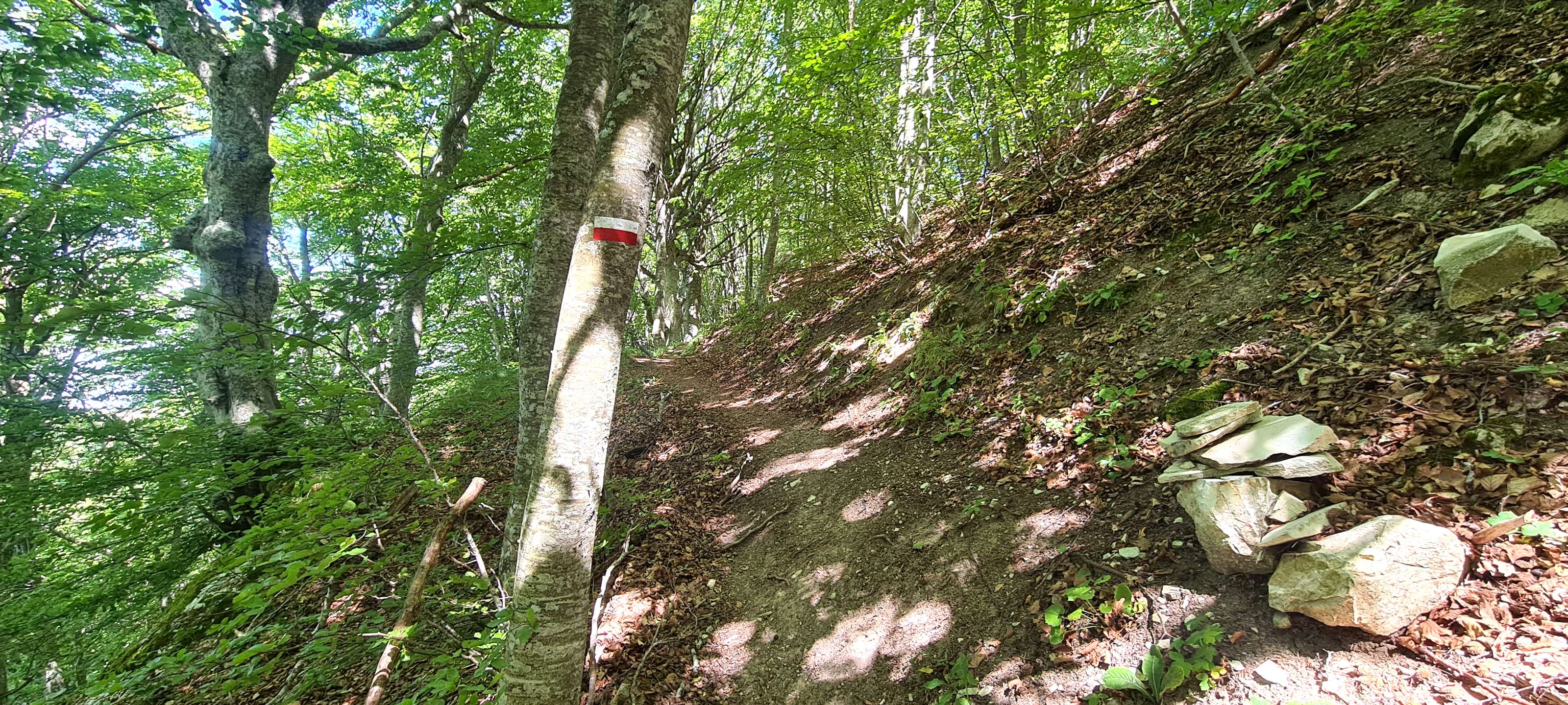 Superata l'area si costeggia la faggeta, incrociando in rapida successione il Sentiero 102B, che si inoltra nel cuore del bosco, e quindi il Sentiero 102C, che attraversa il Torrente Prena per andare poi a raccordarsi con il Sentiero 102.