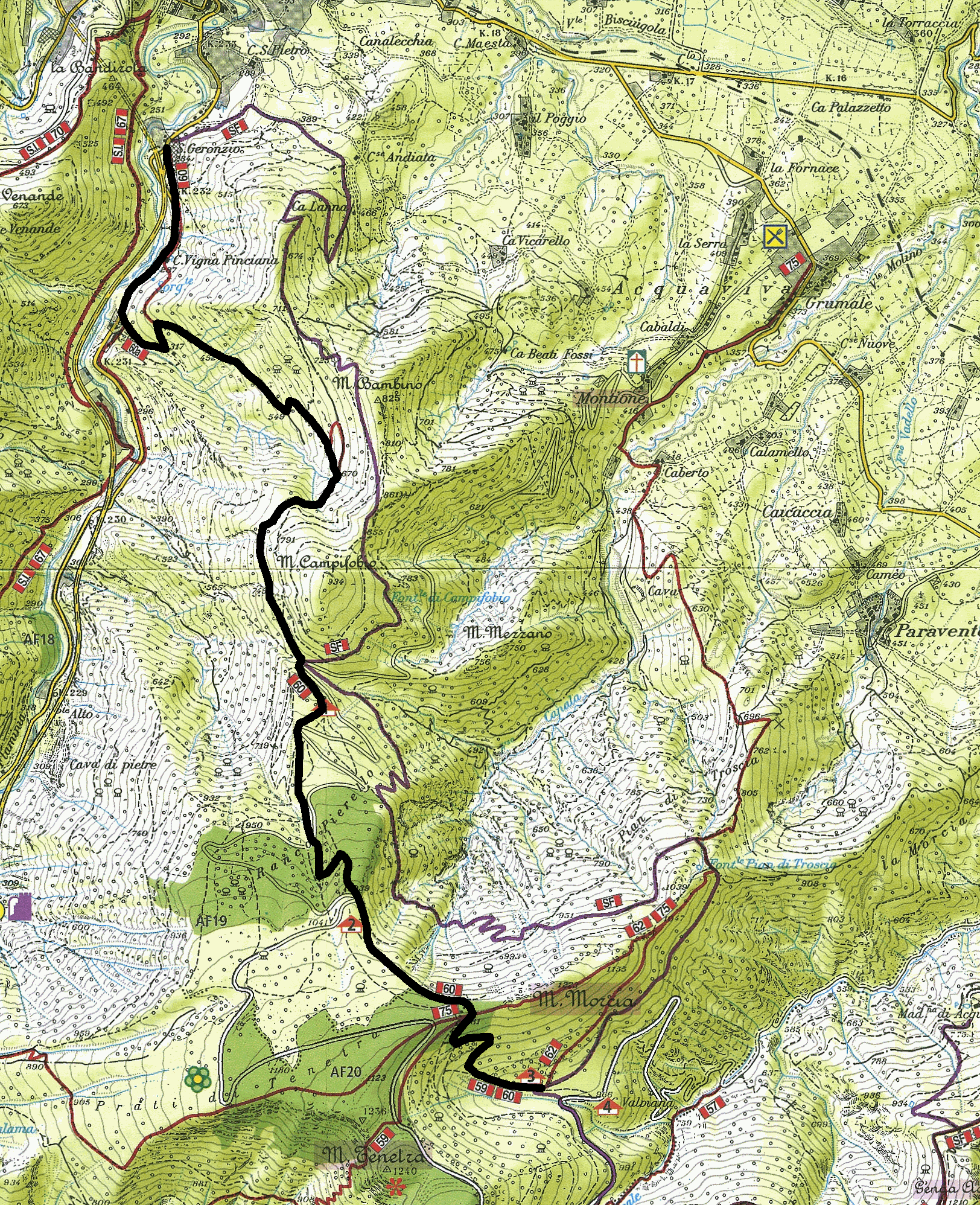 Il percorso originale prevedeva di salire verso sinistra su un sentiero che è stato chiuso dalla realizzazione di alcune abitazioni e successivamente riassorbito dalla vegetazione, quindi si deve giocoforza proseguire per circa 1km sull’asfaltata, raggiungendo il paesino di Foci dal quale parte il raccordo che sulla cartina è contrassegnato come 60a, e che rappresenta l’unica via d’accesso al sentiero (qui si incontra anche il Sentiero Italia (n. 67) che collega Cagli con Cantiano).