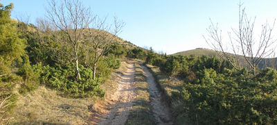 Si segue la strada per qualche centinaio di metri, fino ad una curva a sinistra in corrispondenza della quale si svolta all'interno del bosco, verso destra, su di una debole traccia non sempre semplice da individuare (fare attenzione ai segni sugli alberi), che sale repentinamente fino a sbucare sul crinale soprastante; qui l'ambiente si apre, e si possono osservare notevoli vedute panoramiche sul Monte di Montiego e, alle sue spalle, sull'imponente sagoma del Monte Nerone.