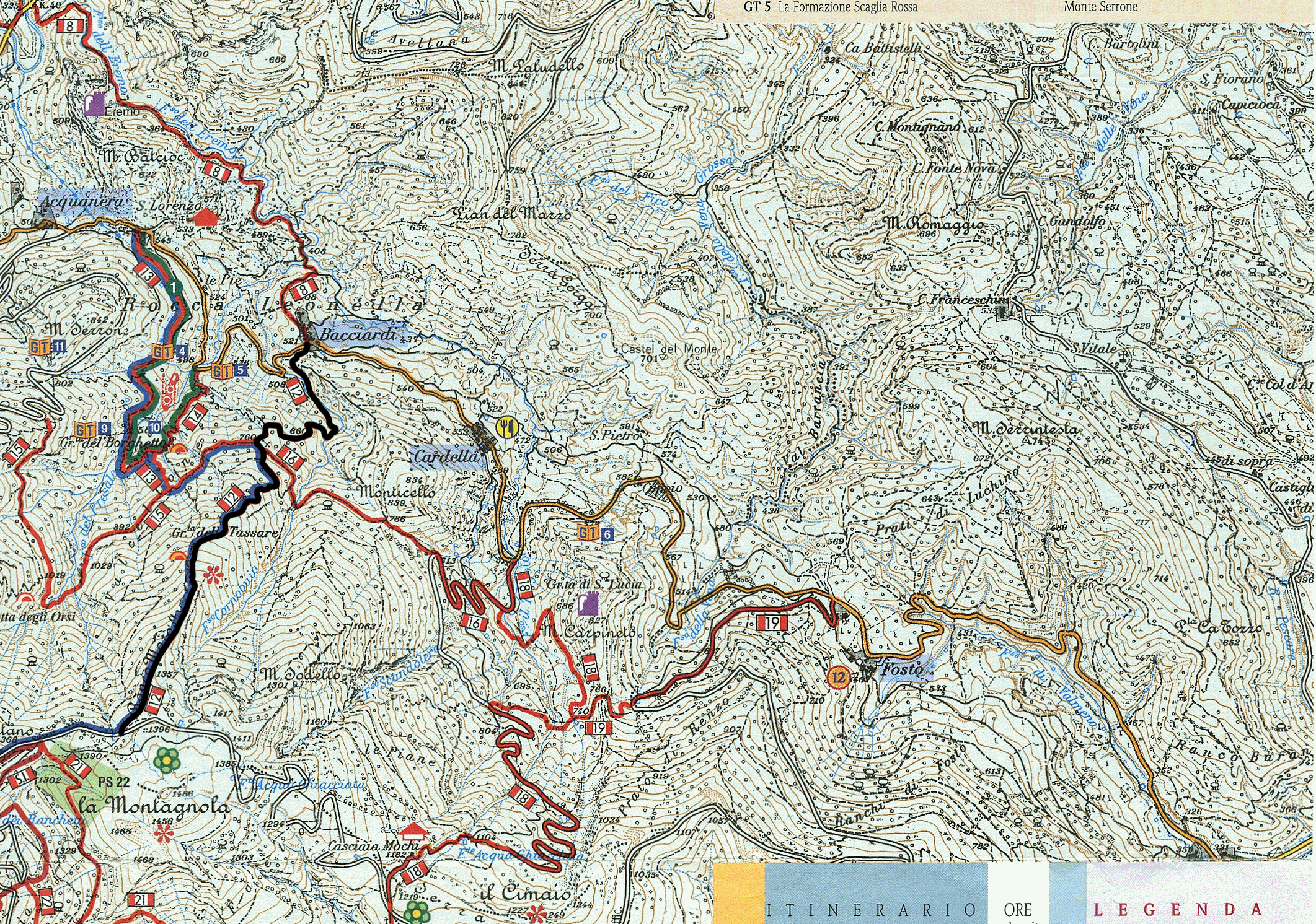 Seguendo la strada per poche decine di metri, verso sinistra, si perviene ad una preziosissima fonte (l’unica di tutto il percorso), con l’ambiente che si apre repentinamente sui prati sommitali sotto il rilievo della Montagnola, ben visibile sulla sinistra, che può essere raggiunto, disponendo di tempo, mediante una ulteriore salita su cresta di media difficoltà, percorrendo ulteriori 100 metri di dislivello. Con la nuova segnatura il percorso è stato allungato di alcune centinaia di metri, tutti su strada asfaltata, che permettono di raggiungere il Sentiero Italia che sale da Pieia verso la vetta del Nerone.