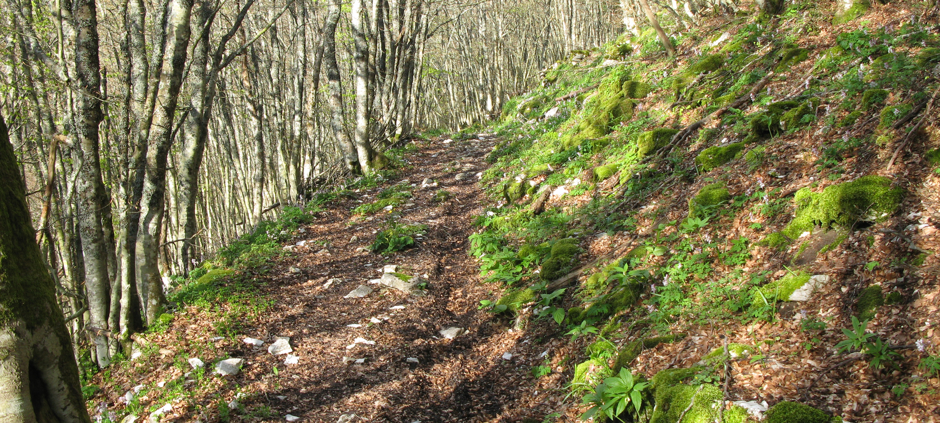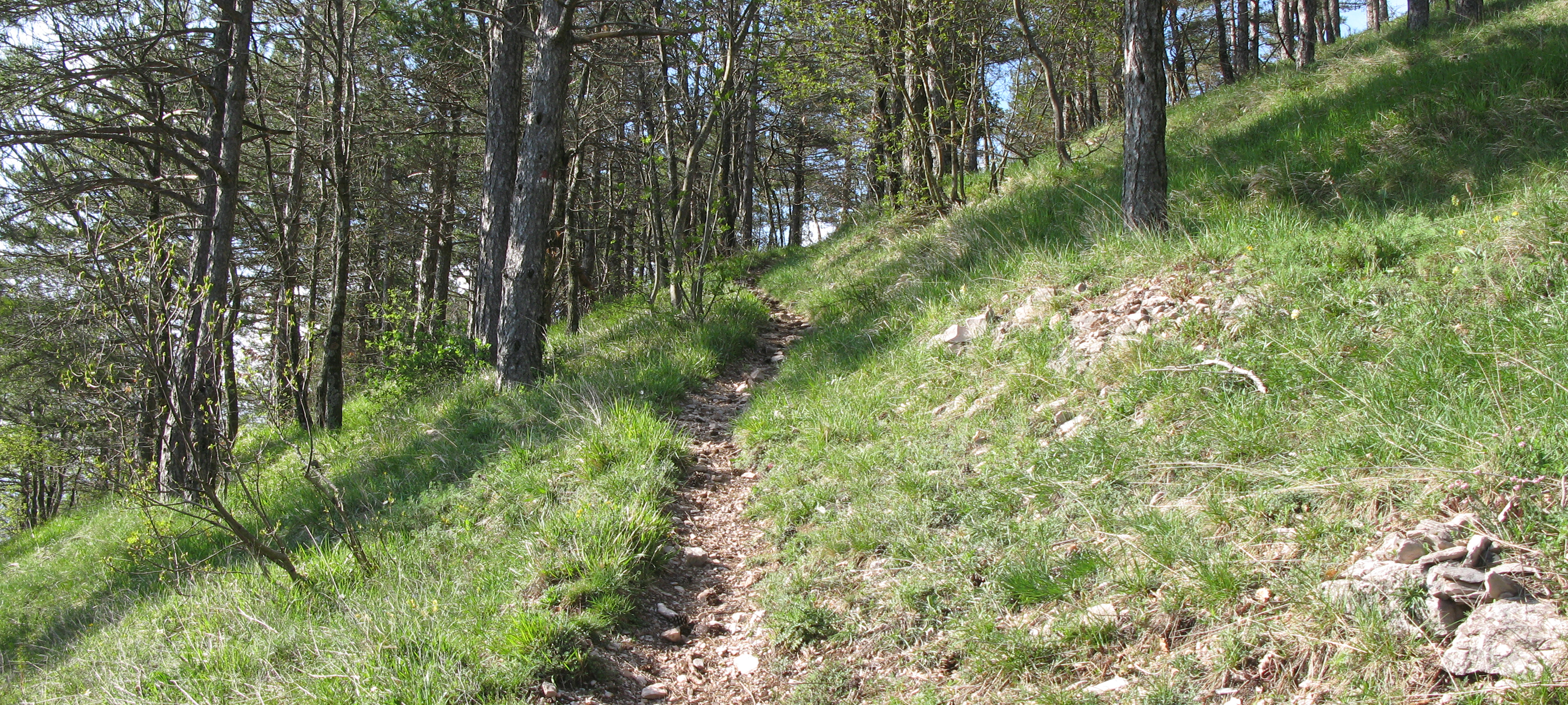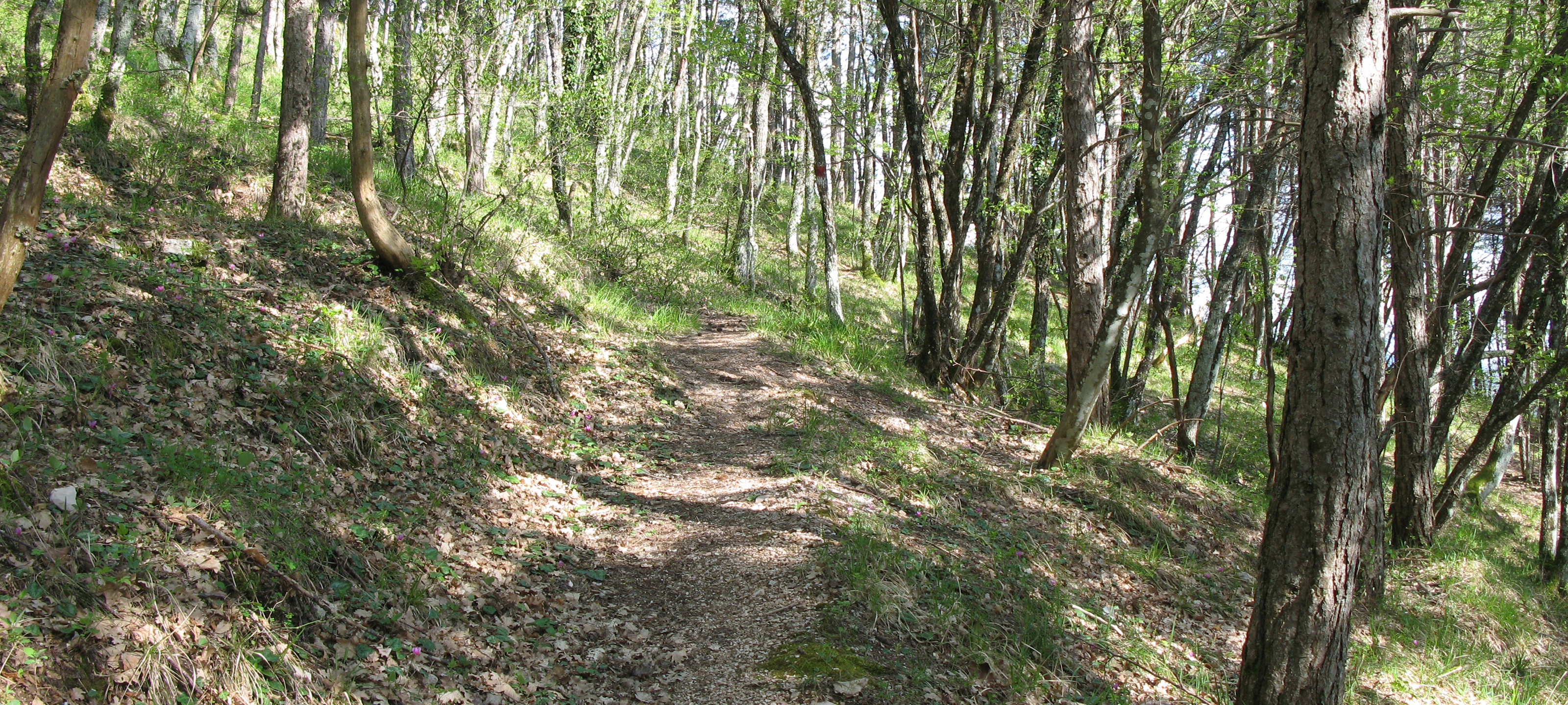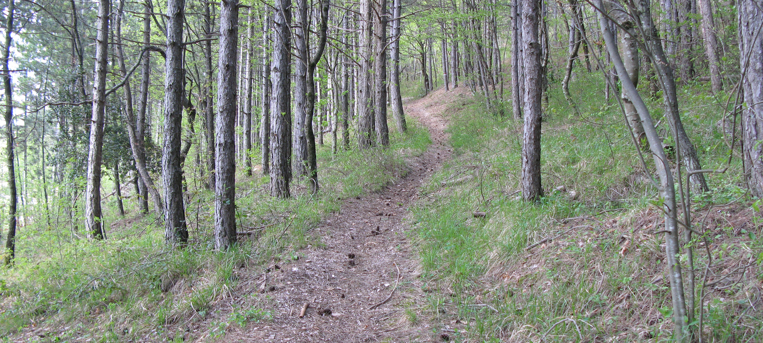 Si inizia seguendo per circa 300 metri la strada, poi la si abbandona imboccando, sulla destra, il sentiero vero e proprio che inizia subito a salire, con discreta pendenza, all’interno di una zona di rimboschimento.