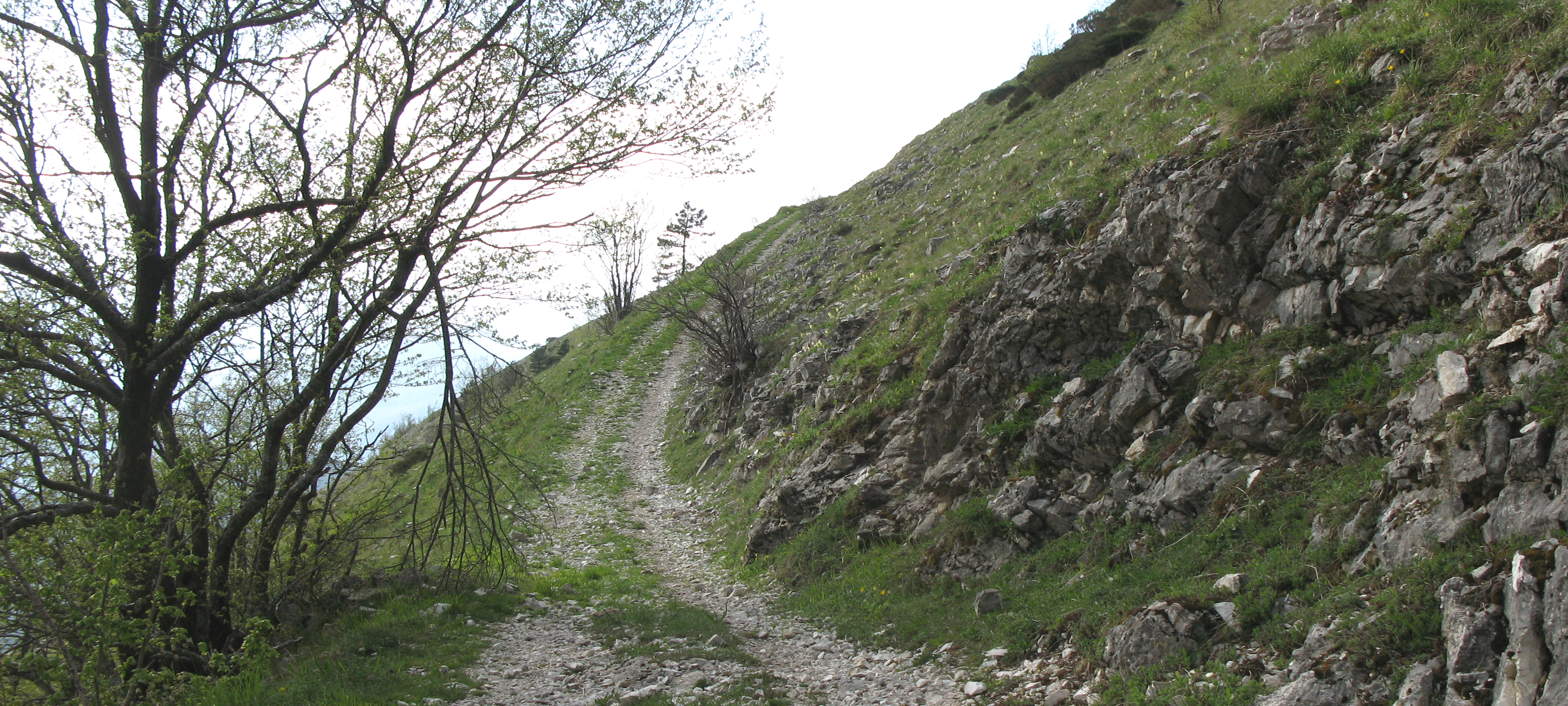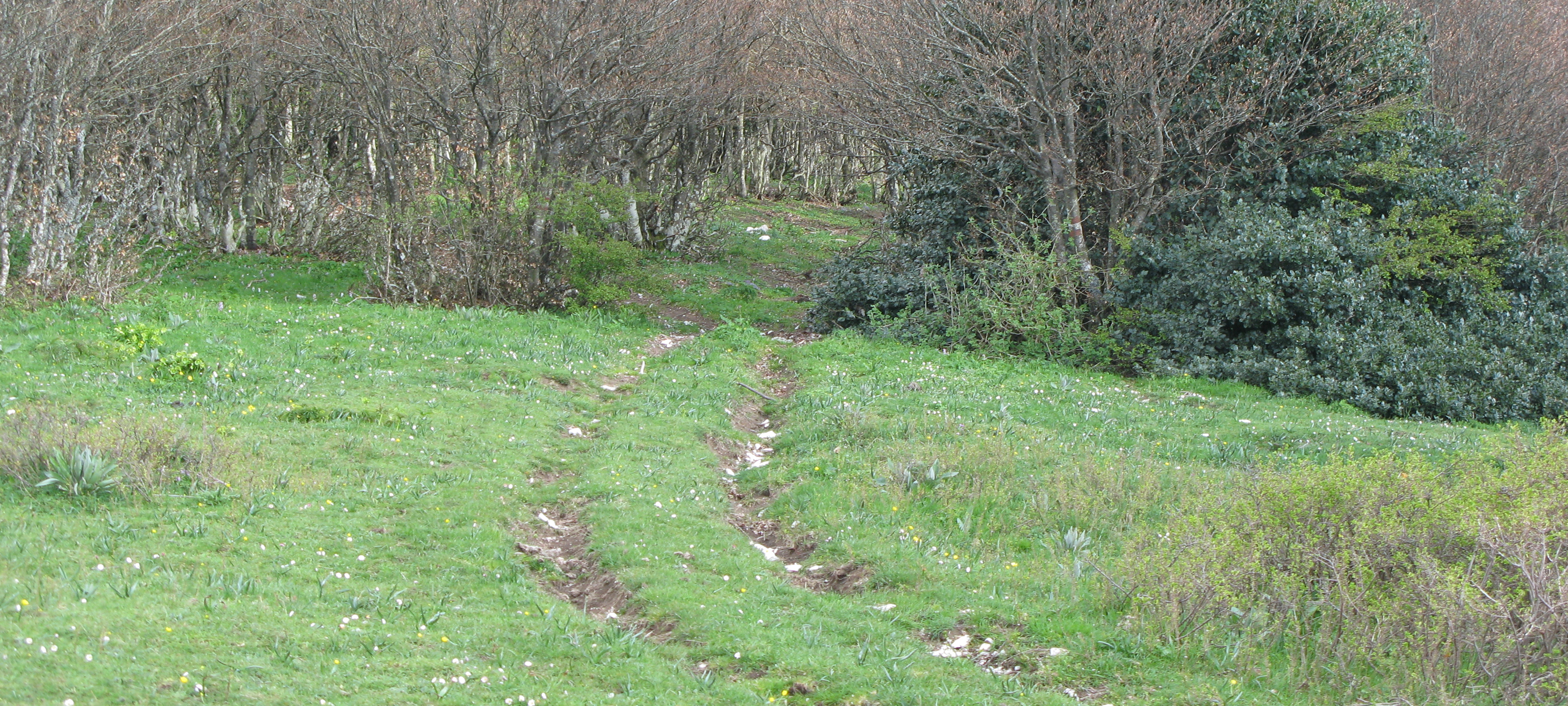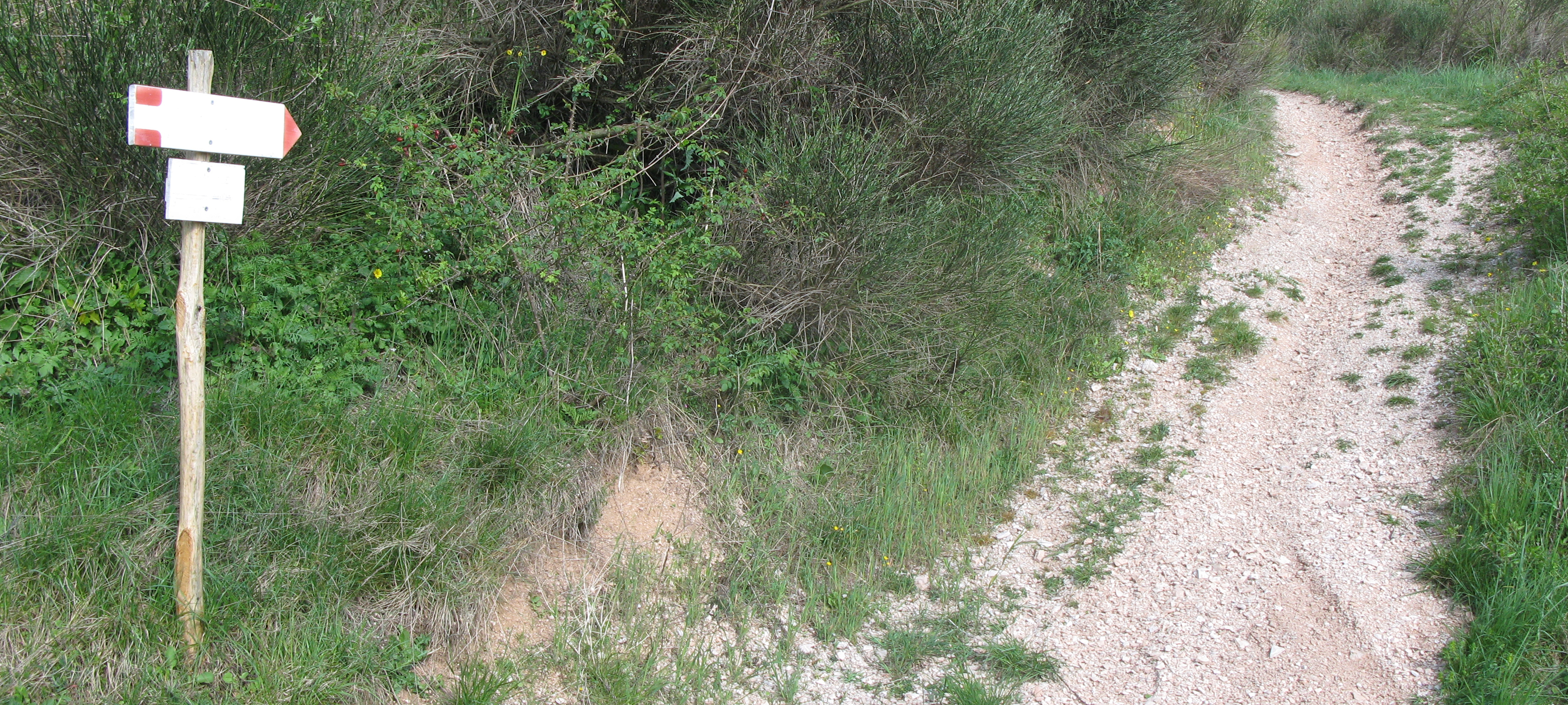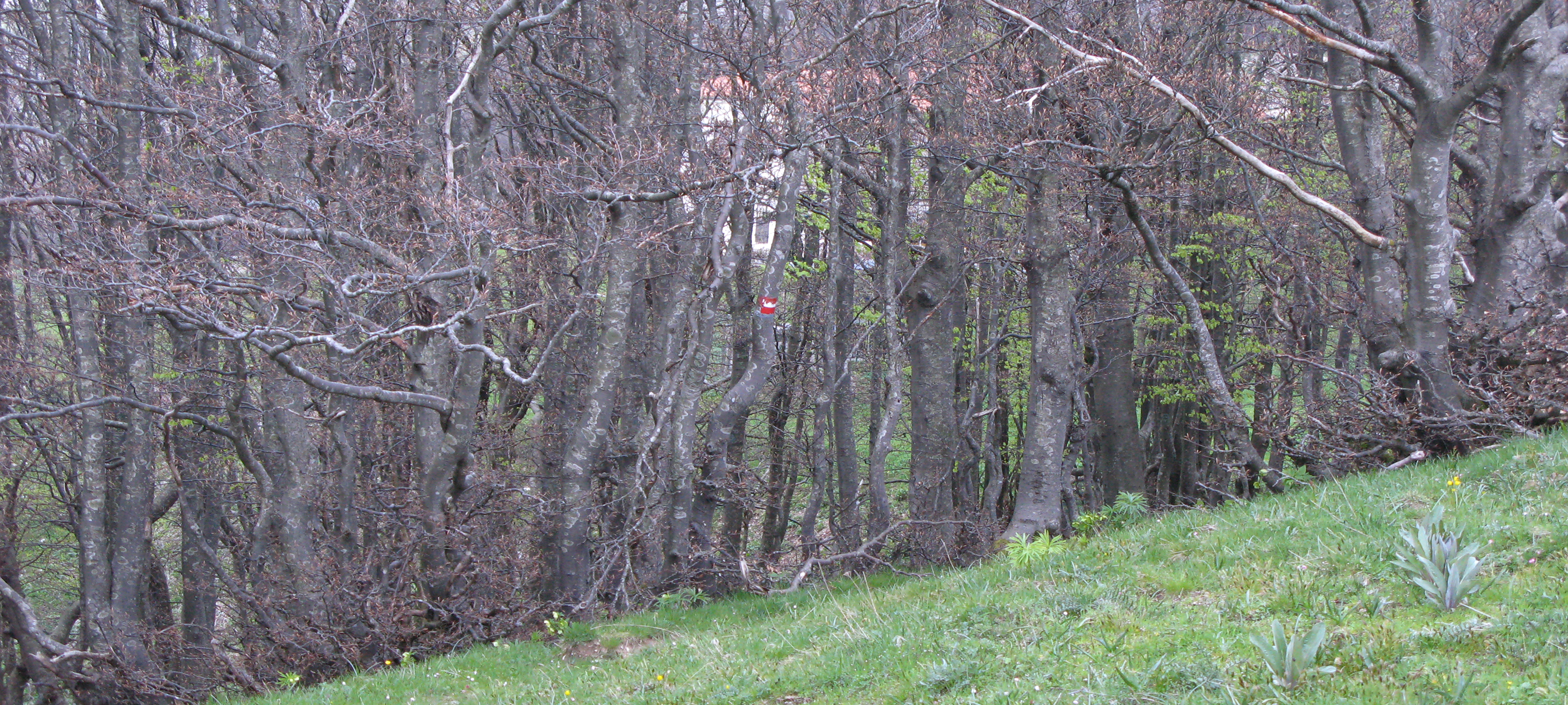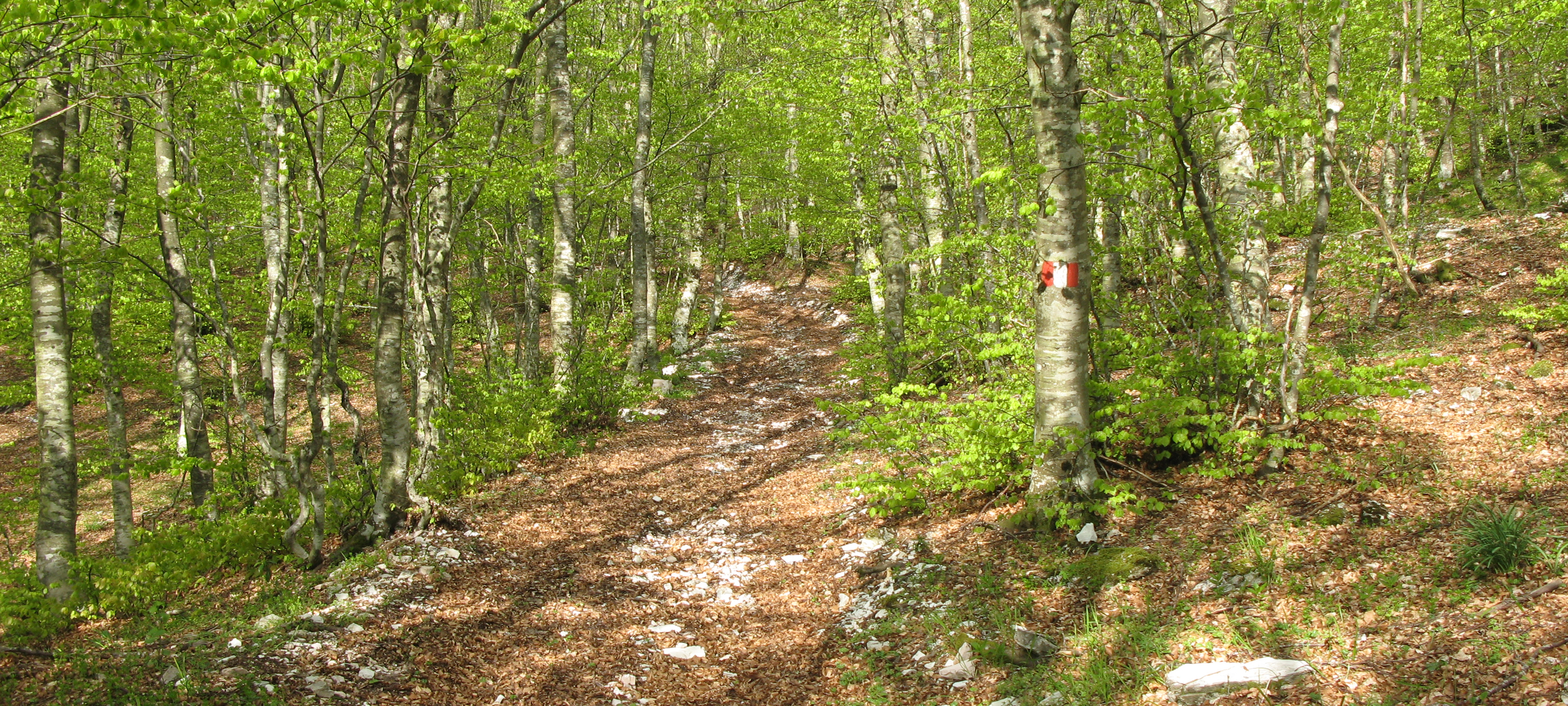 Si inizia seguendo per circa 300 metri la strada, poi la si abbandona imboccando, sulla destra, il sentiero vero e proprio che inizia subito a salire, con discreta pendenza, all’interno di una zona di rimboschimento.