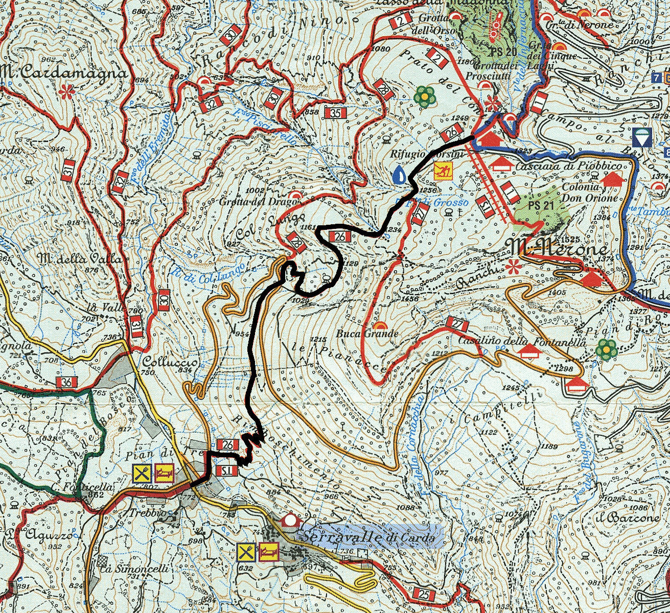 Oltrepassata la strada nei pressi di un grande tornante (qui si incontra anche il punto di partenza del sentiero 28, che sale verso sinistra alla volta della valle del Fosso Pisciarello), si imbocca una strada sbrecciata sulla destra, che conduce in pochi passi al rifugio “Ranco”, presso il quale è posto un abbeveratoio che fornisce una preziosa scorta d’acqua. Superato il rifugio la strada prende a salire in maniera decisa, con il paesaggio circostante che varia alternandosi tra verdi prati e fitte faggete, con la possibilità, nei tratti aperti, di godere di un bel panorama sulla vallata sottostante e sul dirimpettaio Monte Cardamagna.