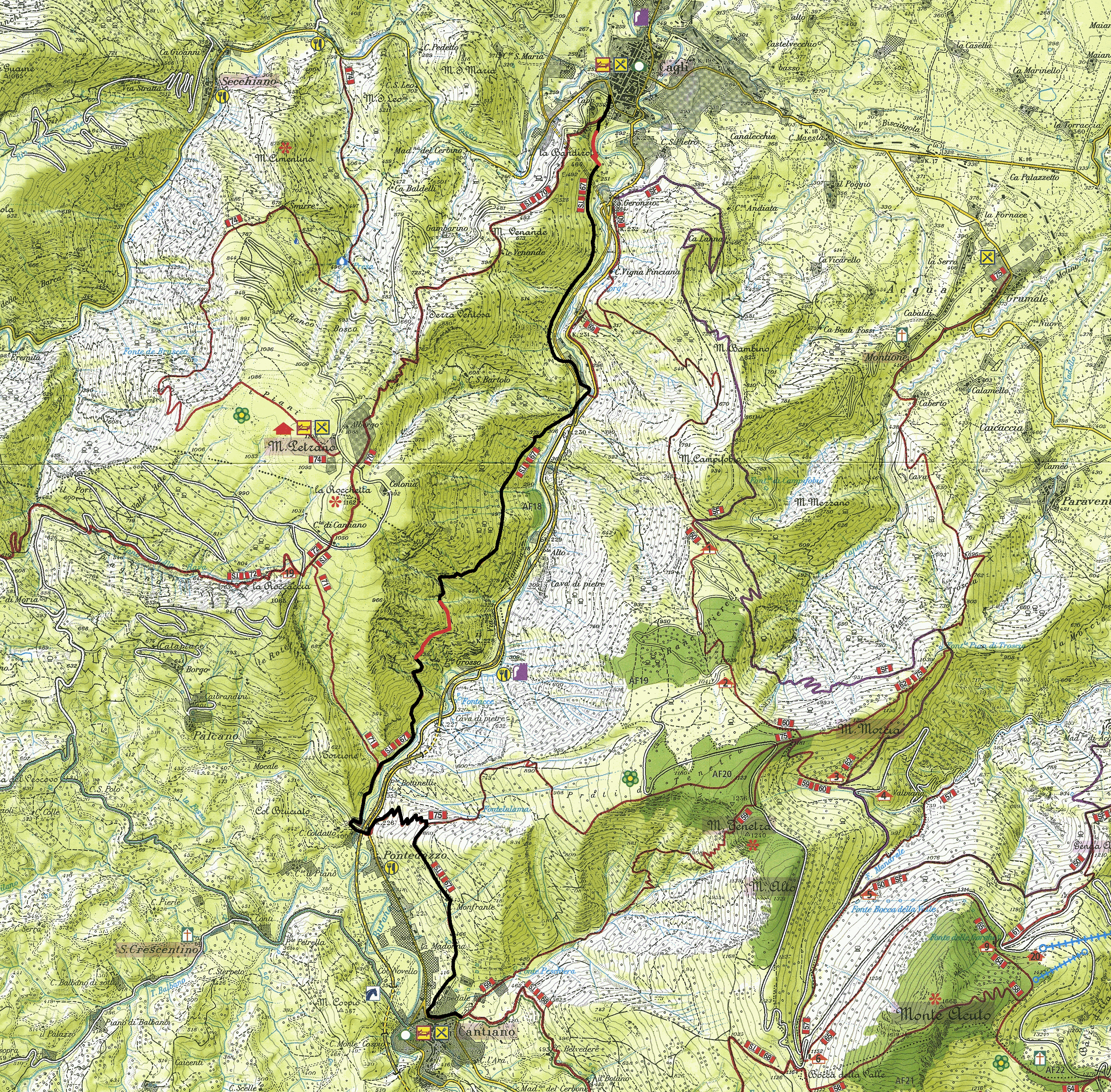 La traccia si allarga fino a diventare una comoda strada sbrecciata che scende dolcemente verso Cantiano lungo le pendici della Cima di Monfrante, una delle vette minori del massiccio del Catria, attraversando alcune abitazioni e giungendo in paese nei pressi dell'ex Ospedale Savini, e quindi proseguendo verso il piazzale del cimitero dove il percorso termina incrociando il sentiero 68, altro tratto di Sentiero Italia che è la naturale prosecuzione verso Chiaserna, ed il ripido e selvaggio 59 che sale verso il caratteristico "imbuto" del Monte Tenetra.