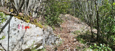 Si percorrono quindi alcune centinaia di metri lungo la strada suddetta, fino a raggiungere, in corrispondenza di un tornante, una svolta a sinistra (segno piuttosto evidente sulle roccette) che conduce al sentiero vero e proprio, agevole ed in leggera discesa.