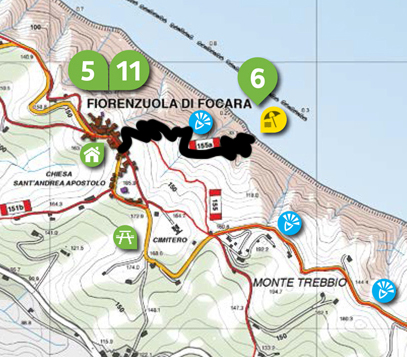 Il sentiero 155a collega, mediante strada asfaltata molto frequentata nei mesi estivi, il caratteristico borgo di Fiorenzuola di Focara, posto su uno sperone roccioso a picco sul mare, alla sottostante spiaggetta, suggestiva ed incontaminata.