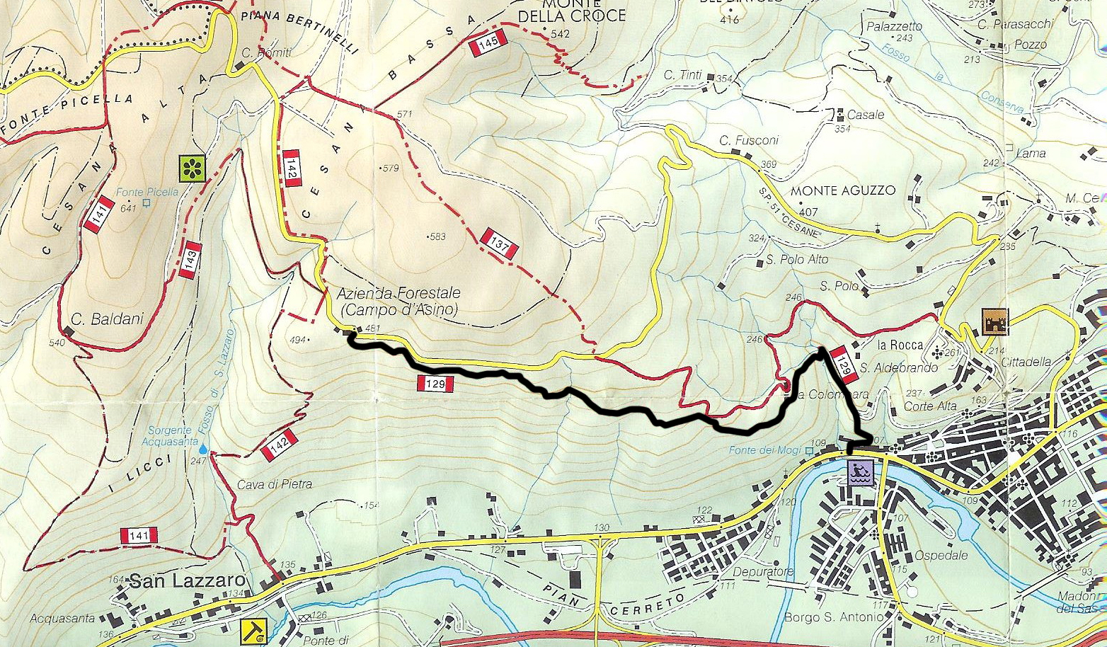 In questo punto, oltrepassando la costruzione, si incrociano altri due sentieri, il 142 che sale da San Lazzaro verso la Piana Bertinelli ed il 143 che conduce a Ca' Baldani.