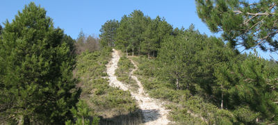 Superato il facile guado si prosegue all’ombra degli alti pini, iniziando a salire in maniera piuttosto decisa superando alcuni tornanti che permettono di guadagnare rapidamente quota, prima di incontrare un lungo traverso che lascia un po’ di respiro, con l’ambiente circostante che si mantiene piuttosto uniforme e tipico del comprensorio delle Cesane.