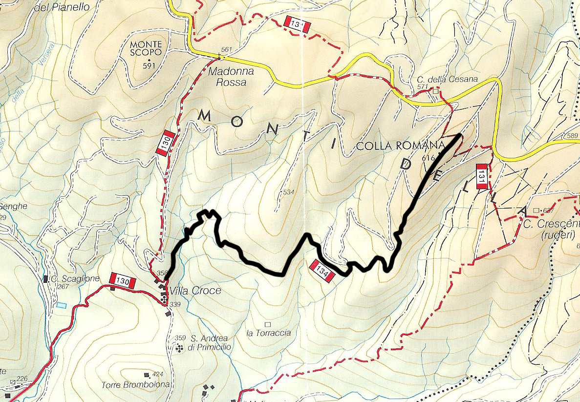 Il percorso termina nel punto denominato “Colla Romana”, uno dei più alti rilievi delle Cesane con i suoi 616 metri di quota, in corrispondenza del quale si incrocia il sentiero 131 che attraversa una buona parte della dorsale e che funge da raccordo ai vari tracciati provenienti dai versanti sottostanti.