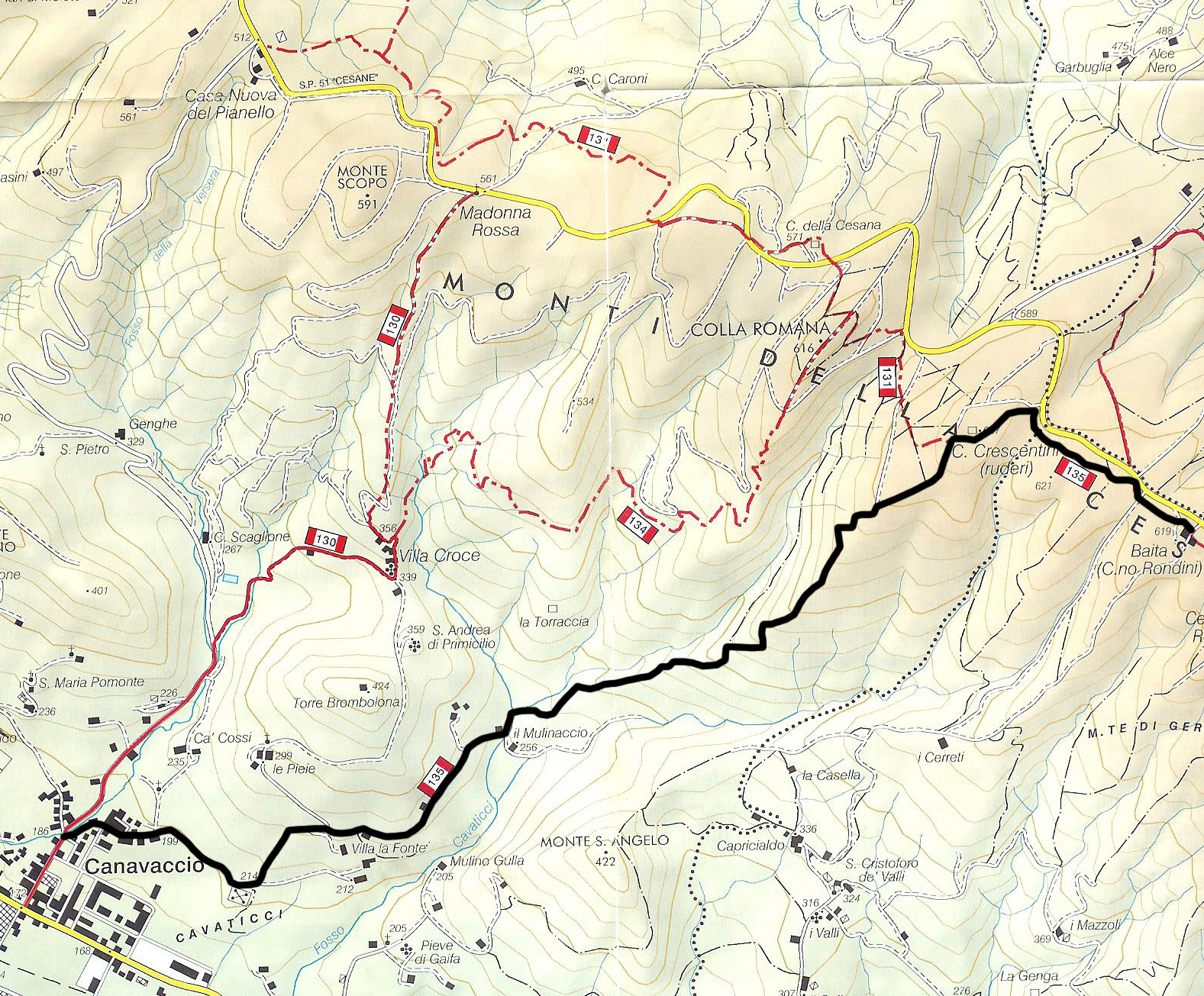 Il sentiero 135 collega il paese di Canavaccio con il ristoro “La Baita” attraverso un itinerario discretamente impegnativo che attraversa il versante sud-ovest delle Cesane. La partenza è comune al sentiero 130, in corrispondenza della strada asfaltata che sale verso l’altopiano, la si segue fino ad un trivio nel quale occorre imboccare la strada di destra, si supera il cimitero ed infine si giunge alla prima freccia direzionale (in corrispondenza della località Villa delle Fonti) indicante numero e tempi di percorrenza.