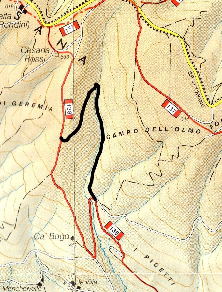 Il bivio, ben segnalato, si trova a pochi metri di distanza dall’innesto con il 138A che è diretto a Ca’ Baldani, nel punto dove la via ordinaria attraversa il fosso, con una svolta a sinistra, per poi salire alla volta di Ca’ Bogo.