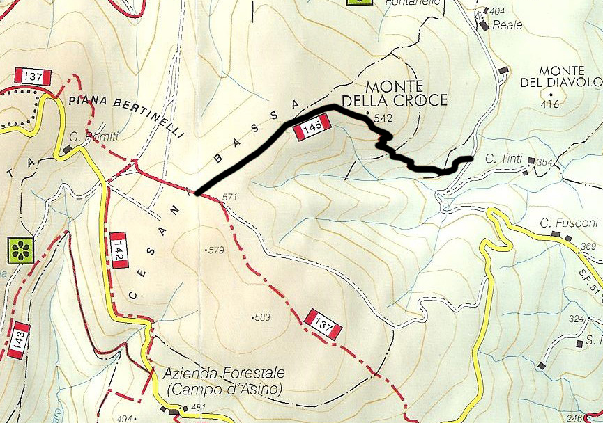 Il sentiero 145 del comprensorio dei Monti delle Cesane ha inizio sulla strada che da Fossombrone conduce alla chiesa di San Piero in Tambis. All'inizio il percorso è abbastanza agevole ed aggira un bosco dall'aspetto quasi spettrale, con molti tronchi secchi e rami spezzati, ma ben presto si giunge al tratto più impegnativo, con la traccia che risale il versante del Monte della Croce descrivendo ampi tornanti, mentre si guadagna rapidamente quota fino a giungere ai 542 metri della cima.