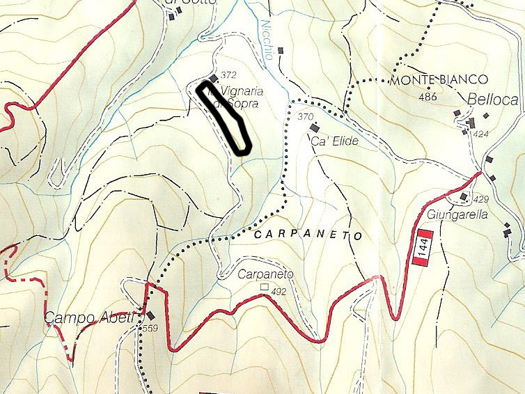 Dopo qualche minuto si costeggia una zona che presenta un fitto sottobosco di ginestre, prima di incontrare una breve discesa seguita da una immediata risalita, che conduce al punto più alto del sentiero, dove si incrocia il Percorso B che sale proveniente anch’esso dall’area attrezzata.
