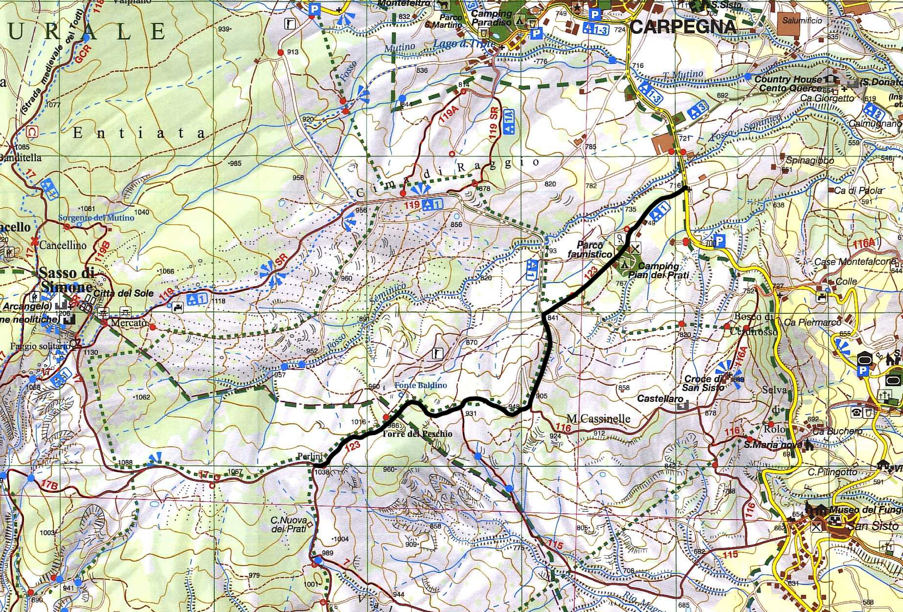Il percorso prosegue lungo la carrareccia, che si segue facendo attenzione a non imboccare una delle numerose stradine laterali (in questo tratto purtroppo la segnatura è carente), superando l'incrocio con il sentiero 119A che si stacca sulla destra, fino a raggiungere un ulteriore incrocio, con il 116 (bivio su cui è stata posta di recente una tabella segnaletica), che scende sulla sinistra diretto a Frontino.